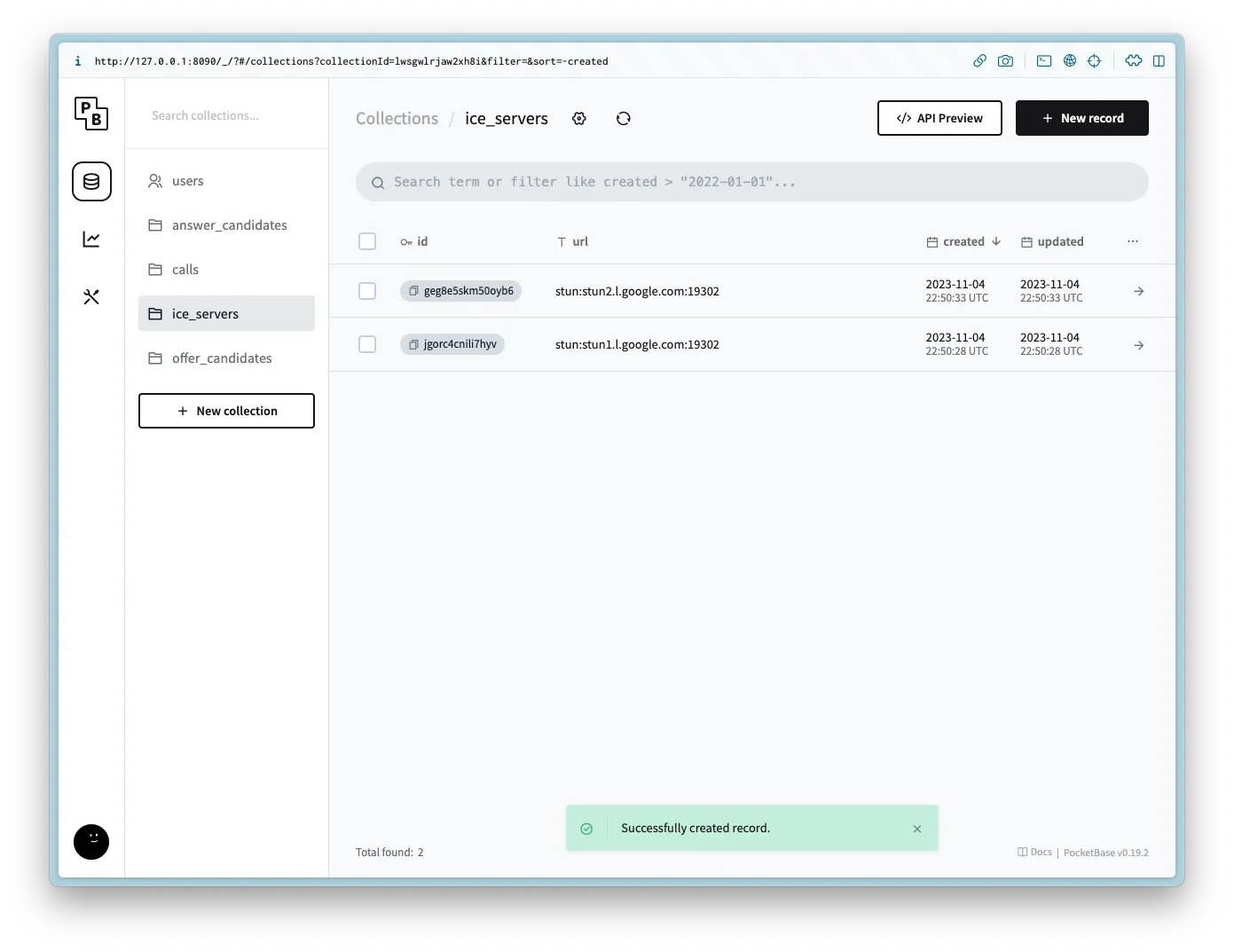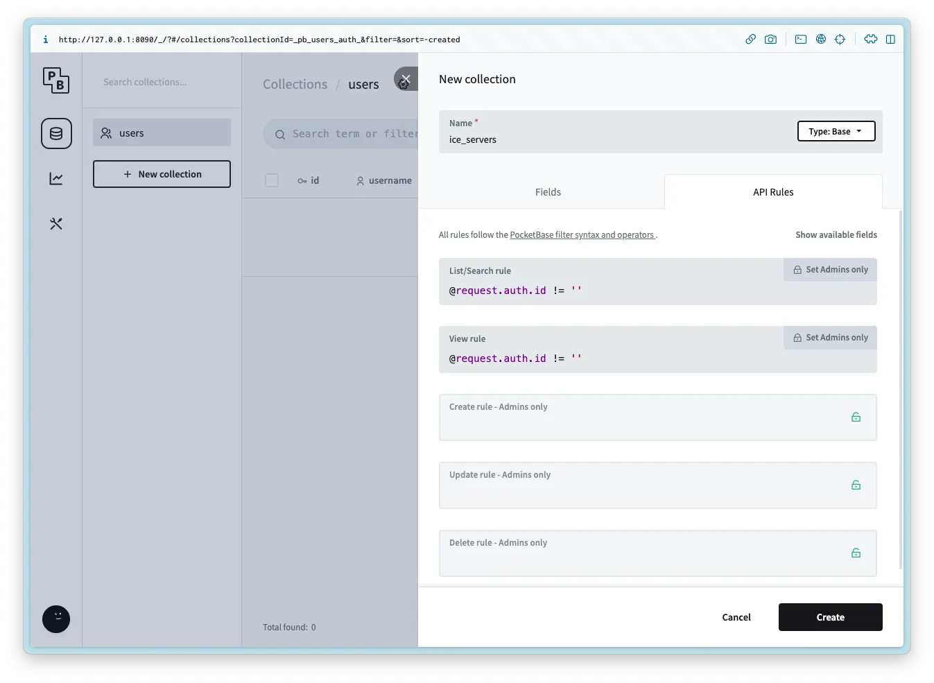Create a new collection named ice_servers with the following columns: