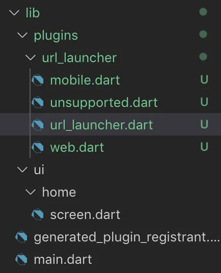 Create a url_launcher folder and file url_launcher.dart, mobile.dart, web.dart, unsupported.dart inside the plugins folder.
