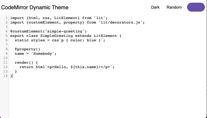 In this article I will go over how to set up a Lit web component and use it to create a a code window that uses CodeMirror and apply a dynamic theme with Material Design.